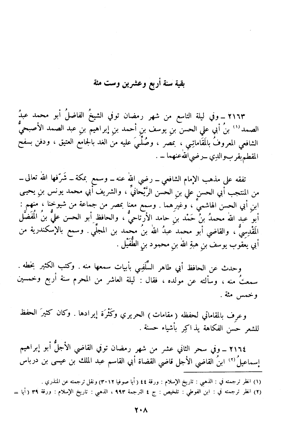 2163 - وفي ليلة التاسع من شهر رمضان توفي الشيخ الفاضل أبو محمد عبد الصمد بن أبي علي الحسن بن يوسف بن أحمد بن إبراهيم بن عبد الصمد الأصبحي الشافعي المعروف بالمقاماتي، بمصر، وصلي عليه من الغد بالجامع العتيق، ودفن بسفح المقطم بقرب والدي –رضي الله عنهما-.