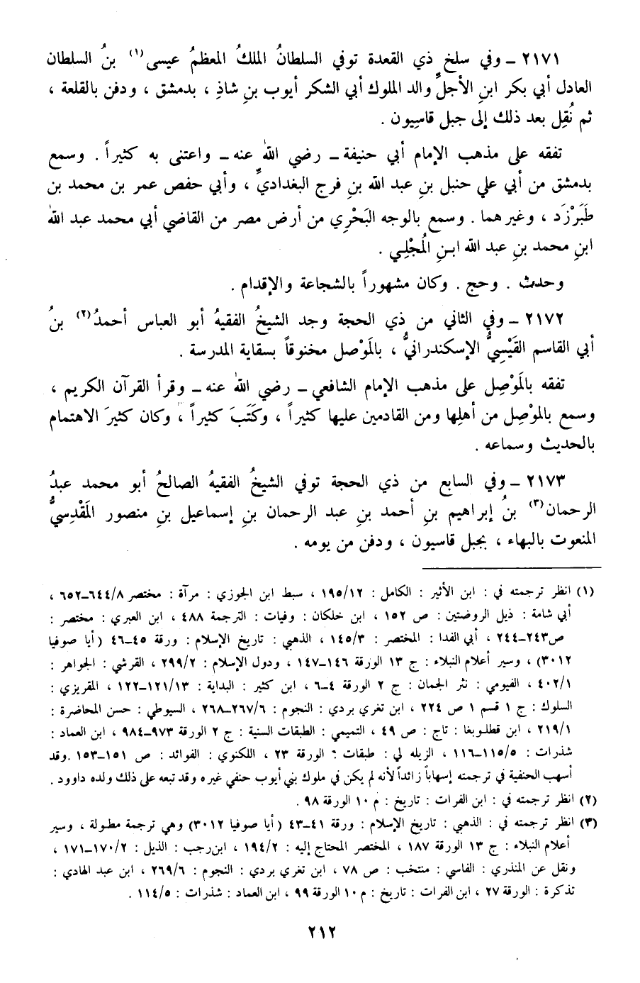 2173 - وفي السابع من ذي الحجة توفي الشيخ الفقيه الصالح أبو محمد عبد الرحمان بن إبراهيم بن أحمد بن عبد الرحمان بن إسماعيل بن منصور المقدسي المنعوت بالبهاء، بجبل قاسيون، ودفن من يومه.