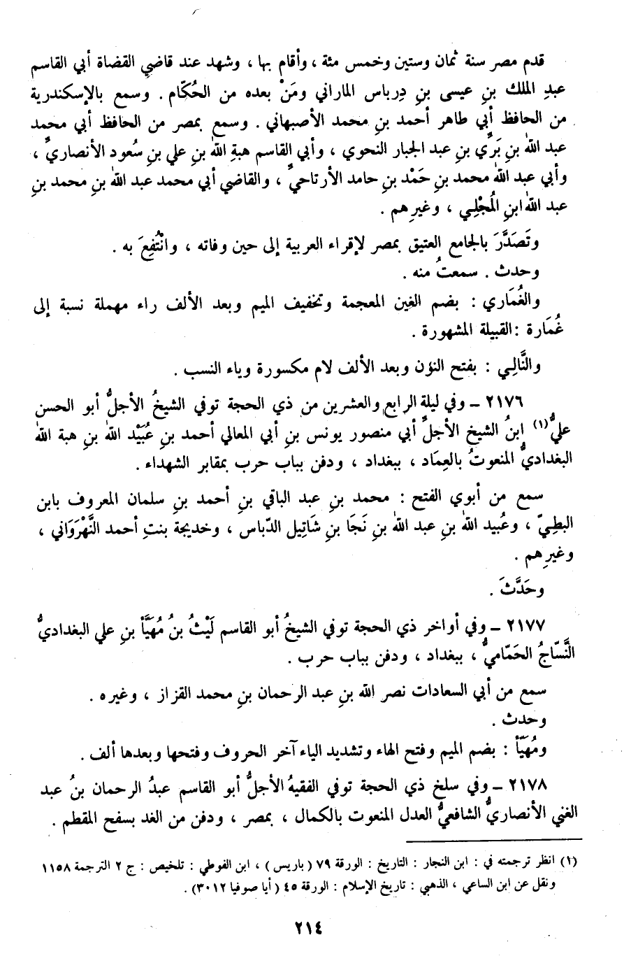 2178 - وفي سلخ ذي الحجة توفي الفقيه الأجل أبو القاسم عبد الرحمان بن عبد الغني الأنصاري الشافعي العدل المنعوت بالكمال، بمصر، ودفن من الغد بسفح المقطم.