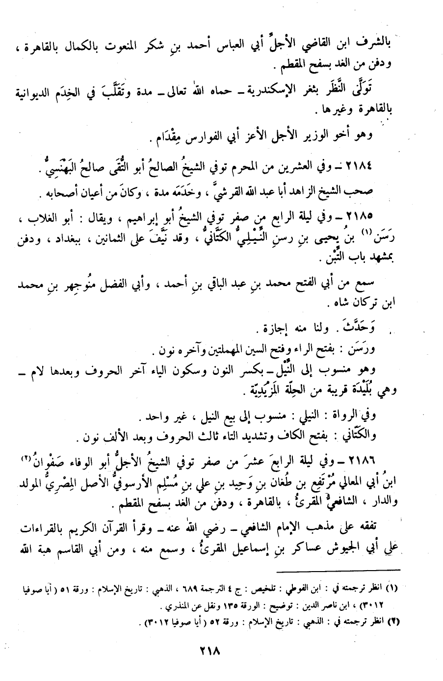 2186 - وفي ليلة الرابع عشر من صفر توفي الشيخ الأجل أبو الوفاء صفوان بن أبي المعالي مرتفع بن طغان بن وحيد بن علي بن مسلم الأرسوفي الأصل المصري المولد والدار، الشافعي المقرئ، بالقاهرة، ودفن من الغد بسفح المقطم.