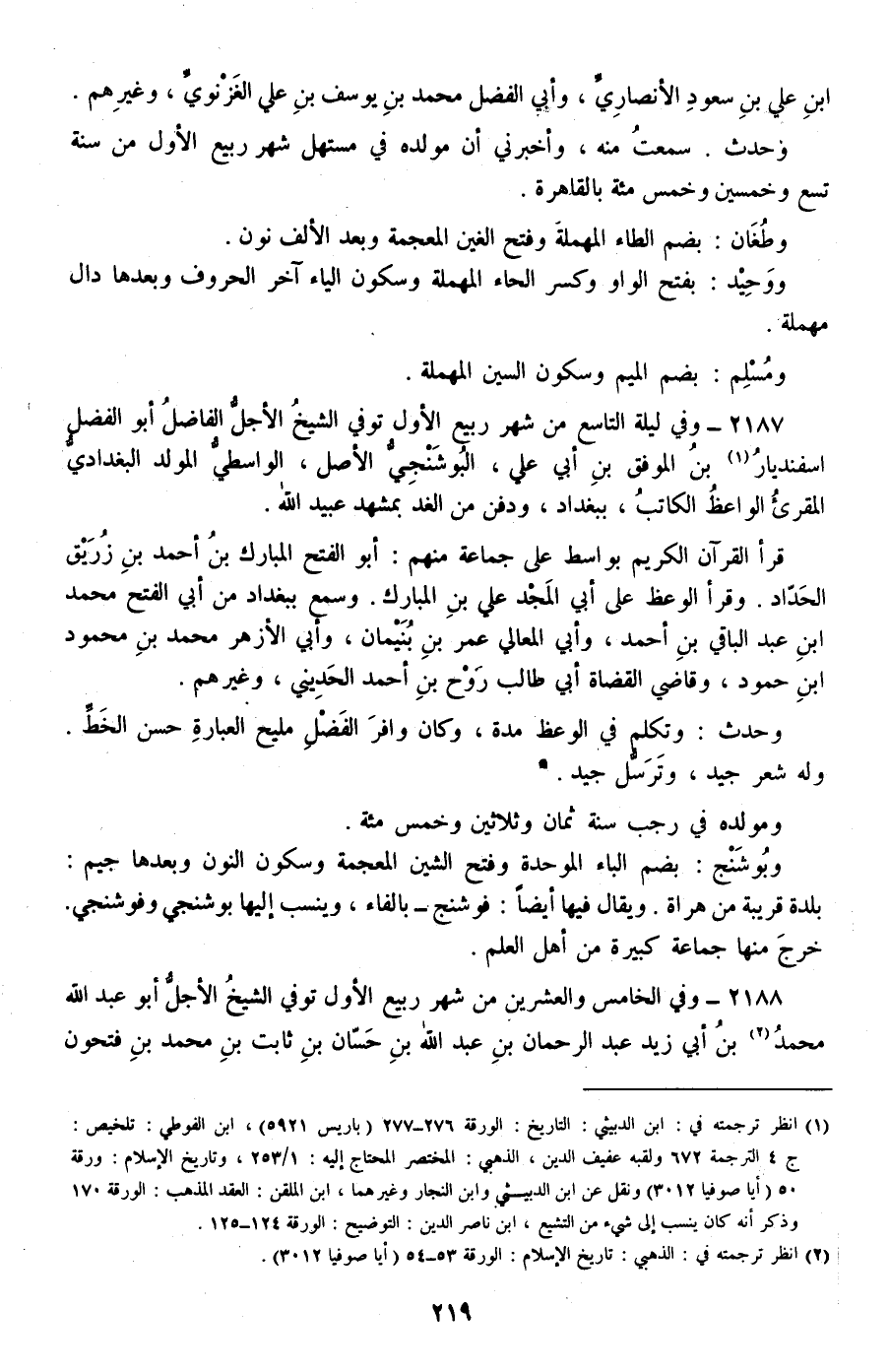 2187 - وفي ليلة التاسع من شهر ربيع الأول توفي الشيخ الأجل الفاضل أبو الفضل اسفنديار بن الموفق بن أبي علي، البوشنجي الأصل، الواسطي المولد البغدادي المقرئ الواعظ الكاتب، ببغداد، ودفن من الغد بمشهد عبيد الله.