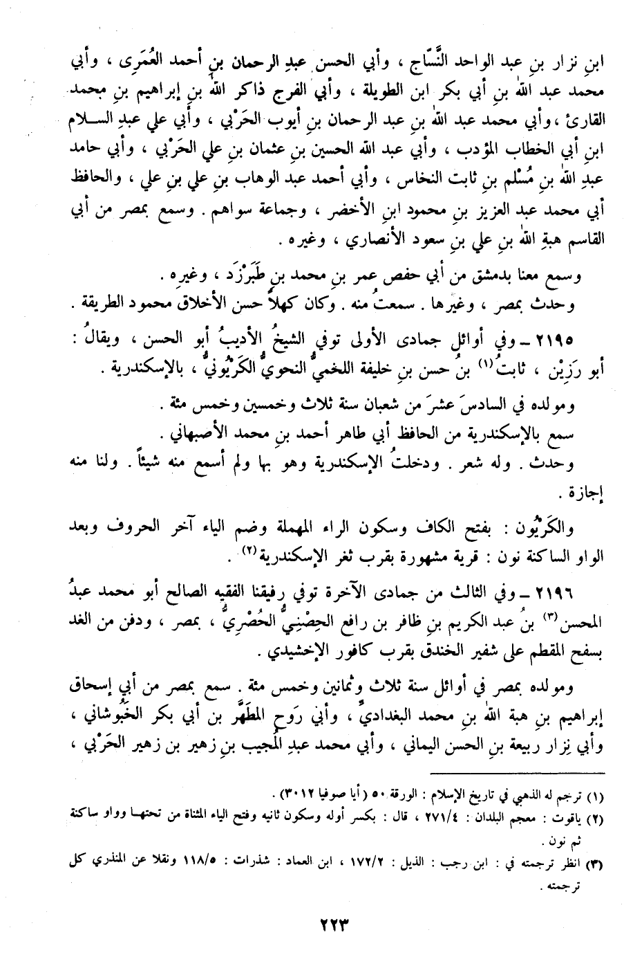 2196 - وفي الثالث من جمادى الآخرة توفي رفيقنا الفقيه الصالح أبو محمد عبد المحسن بن عبد الكريم بن ظافر بن رافع الحصني الحصري، بمصر، ودفن من الغد بسفح المقطم على شفير الخندق بقرب كافور الإخشيدي.