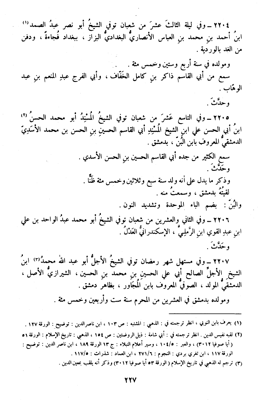 2204 - وفي ليلة الثالث عشر من شعبان توفي الشيخ أبو نصر عبد الصمد بن أحمد بن محمد بن العباس الأنصاري البغدادي البزاز، ببغداد فجاءة، ودفن من الغد بالوردية.