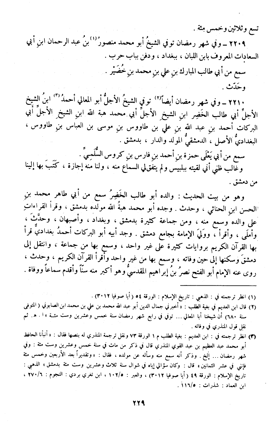 2209 - وفي شهر رمضان توفي الشيخ أبو محمد منصور بن عبد الرحمان بن أبي السعادات المعروف بابن اللبان، ببغداد، ودفن بباب حرب.