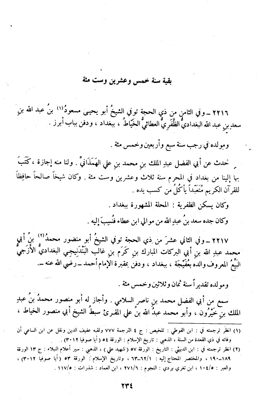 2216 - وفي الثامن من ذي الحجة توفي الشيخ أبو يحيى مسعود بن عبد الله بن سعد بن عبد الله البغدادي الظفري العطائي الخياط، ببغداد، ودفن بباب أبرز.