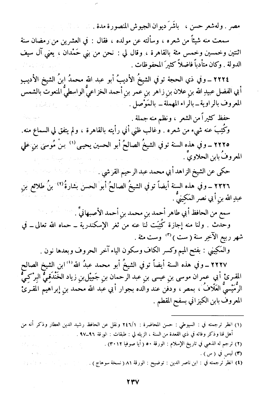 2226 - وفي هذه السنة أيضا توفي الشيخ الصالح أبو الحسن بشارة بن طلائع بن عبد الله بن أبي نصر المكيني