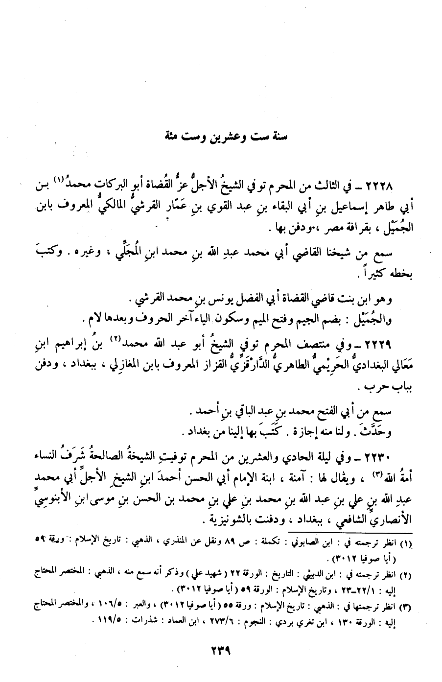 2230 - وفي ليلة الحادي والعشرين من المحرم توفيت الشيخة الصالحة شرف النساء أمة الله، ويقال لها: آمنة، ابنة الإمام أبي الحسن أحمد ابن الشيخ الأجل أبي محمد عبد الله بن علي بن عبد الله بن محمد بن علي بن محمد بن الحسن بن موسى بن الأبنوسي الأنصاري الشافعي، ببغداد، ودفنت بالشونيزية.