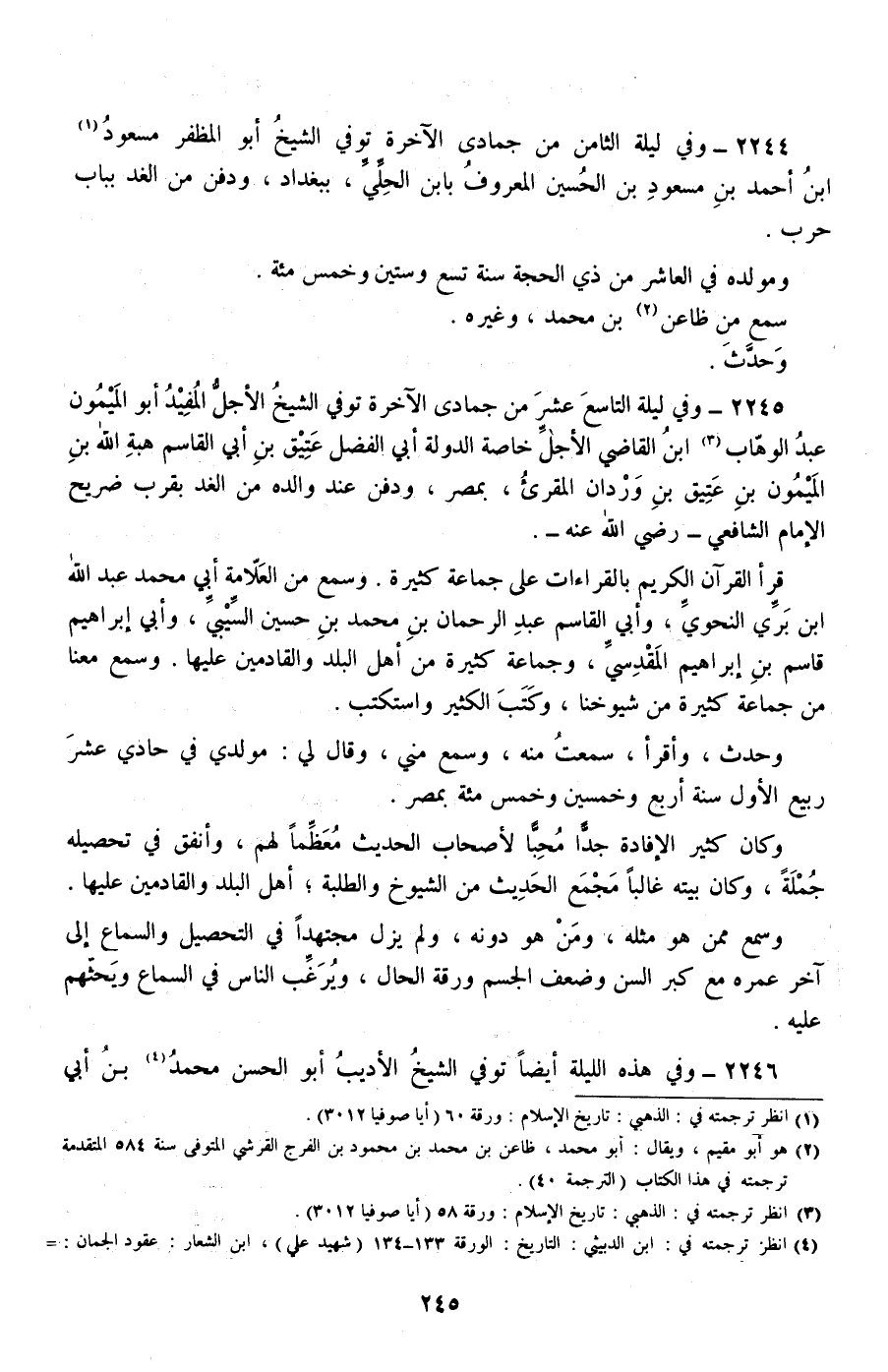 2244 - وفي ليلة الثامن من جمادى الآخرة توفي الشيخ أبو المظفر مسعود بن أحمد بن مسعود بن الحسين المعروف بابن الحلي، ببغداد، ودفن من الغد بباب حرب.