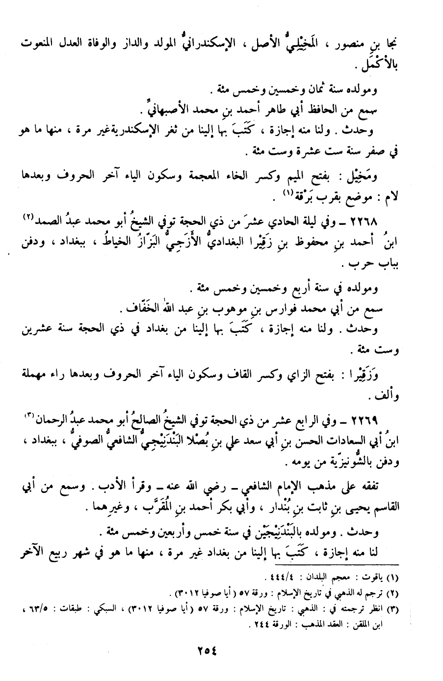 2269 - وفي الرابع عشر من ذي الحجة توفي الشيخ الصالح أبو محمد عبد الرحمان بن أبي السعادات الحسن بن أبي سعد علي بن بصلا البندنيجي الشافعي الصوفي، ببغداد، ودفن بالشونيزية من يومه.