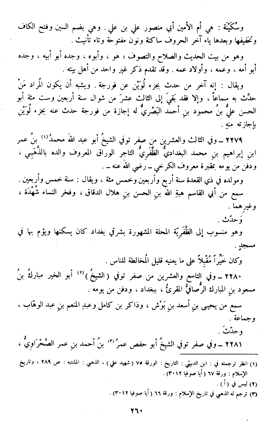 2279 - وفي الثالث والعشرين من صفر توفي الشيخ أبو عبد الله محمد بن عمر بن إبراهيم بن محمد البغدادي الظفري التاجر الوراق المعروف والده بالذهبي، ودفن من يومه بمقبرة معروف الكرخي -رضي الله عنه-.