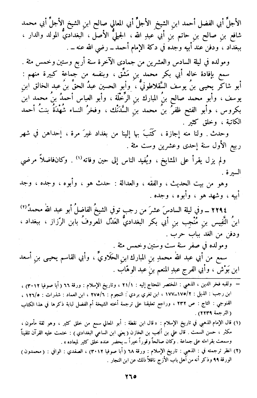 2294 - وفي ليلة السادس عشر من رجب توفي الشيخ الفاضل أبو عبد الله محمد بن النفيس بن منجب بن أبي بكر البغدادي العدل المعروف بابن الرزاز، ببغداد، ودفن من الغد بباب حرب.
