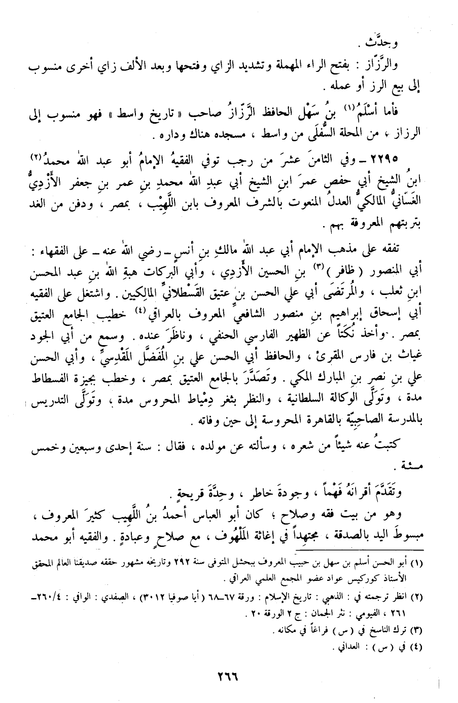 2295 - وفي الثامن عشر من رجب توفي الفقيه الإمام أبو عبد الله محمد ابن الشيخ أبي حفص عمر ابن الشيخ أبي عبد الله محمد بن عمر بن جعفر الأزدي الغساني المالكي العدل المنعوت بالشرف المعروف بابن اللهيب، بمصر، ودفن من الغد بتربتهم المعروفة بهم.