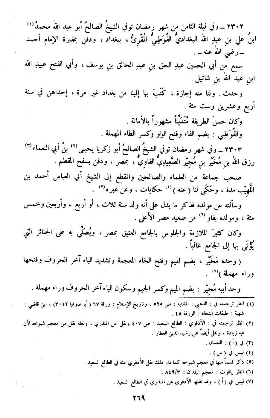 2302 - وفي ليلة الثامن من شهر رمضان توفي الشيخ الصالح أبو عبد الله محمد بن علي بن عبد الله البغدادي الفوطي المقرئ، ببغداد، ودفن بمقبرة الإمام أحمد -رضي الله عنه-.