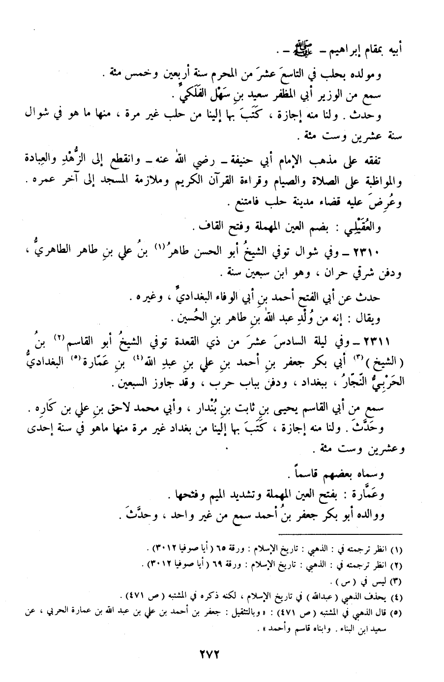 2310 - وفي شوال توفي الشيخ أبو الحسن طاهر بن علي بن طاهر الطاهري، ودفن شرقي حران، وهو ابن سبعين سنة.