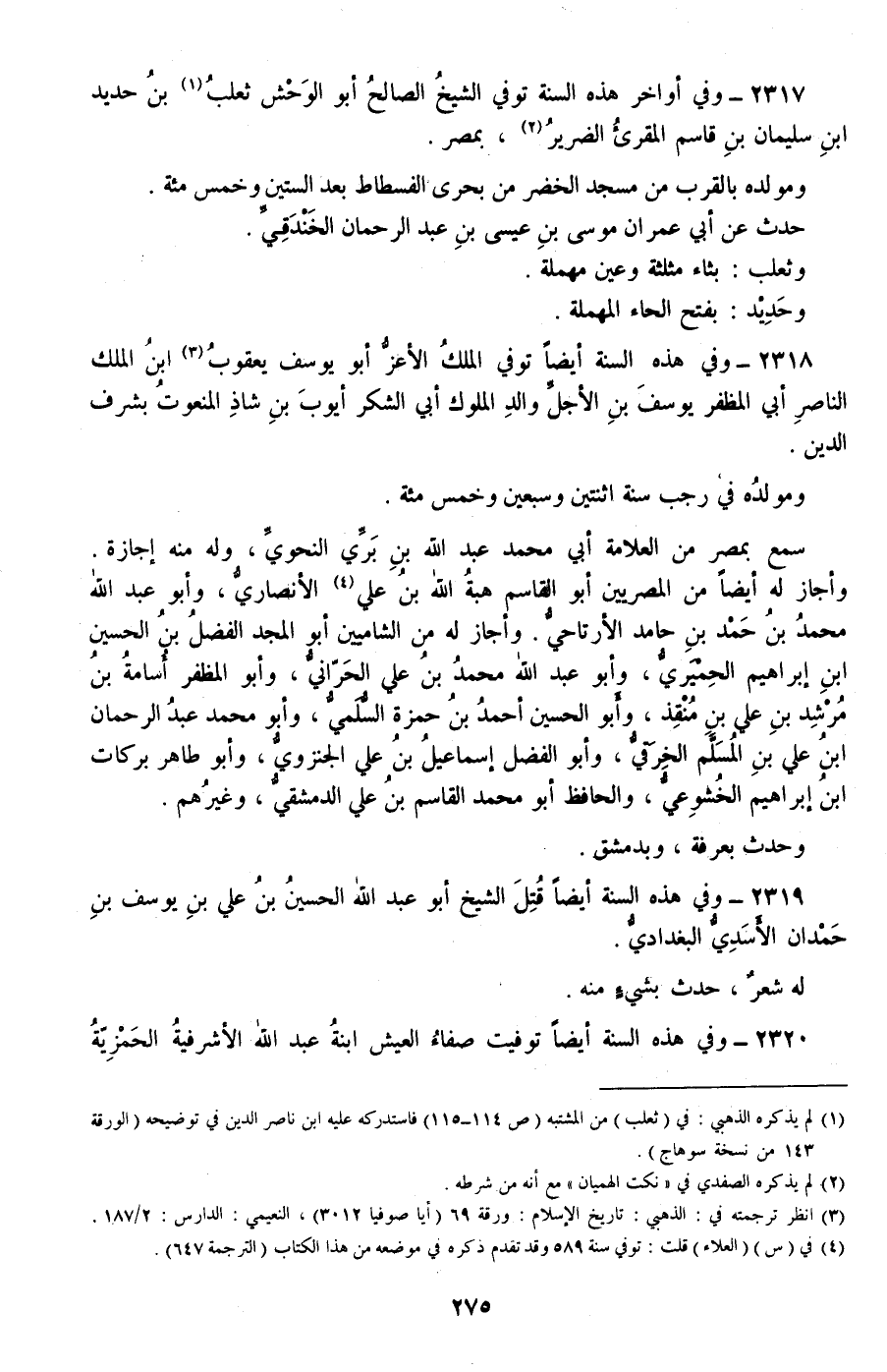 2317 - وفي أواخر هذه السنة توفي الشيخ الصالح أبو الوحش ثعلب بن حديد بن سليمان بن قاسم المقرئ الضرير، بمصر.