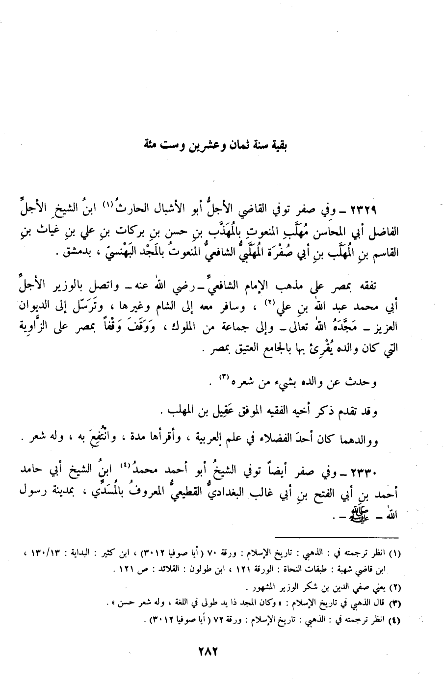 2329 - وفي صفر توفي القاضي الأجل أبو الأشبال الحارث ابن الشيخ الأجل الفاضل أبي المحاسن مهلب المنعوت بالمهذب بن حسن بن بركات بن علي بن غياث بن القاسم بن المهلب بن أبي صفرة المهلبي الشافعي المنعوت بالمجد البهنسي، بدمشق.