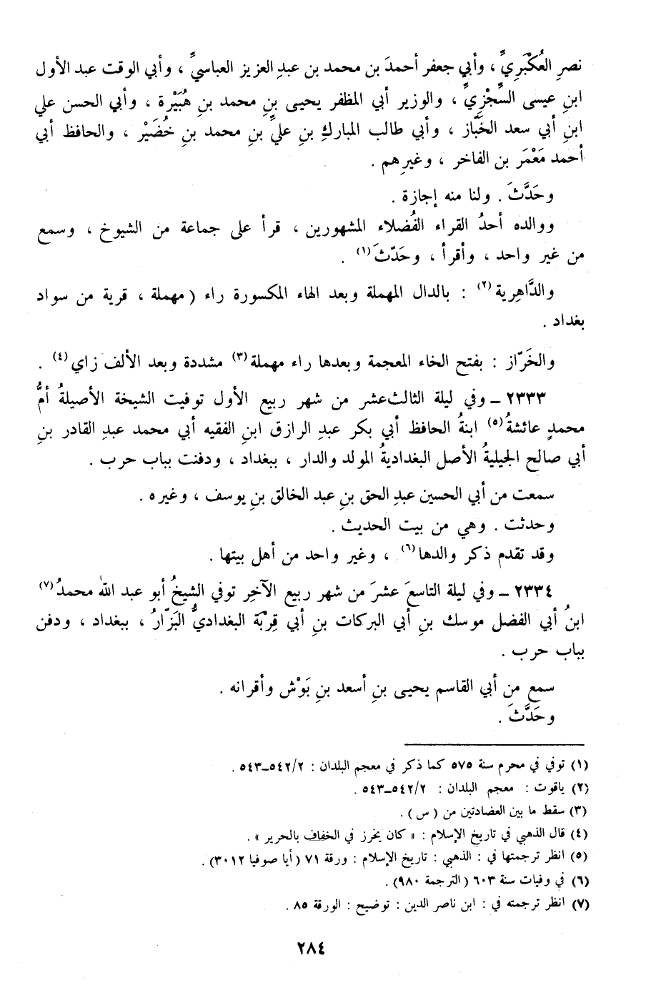 2334 - وفي ليلة التاسع عشر من شهر ربيع الآخر توفي الشيخ أبو عبد الله محمد بن أبي الفضل موسك بن أبي البركات بن أبي قربة البغدادي البزار، ببغداد، ودفن بباب حرب.