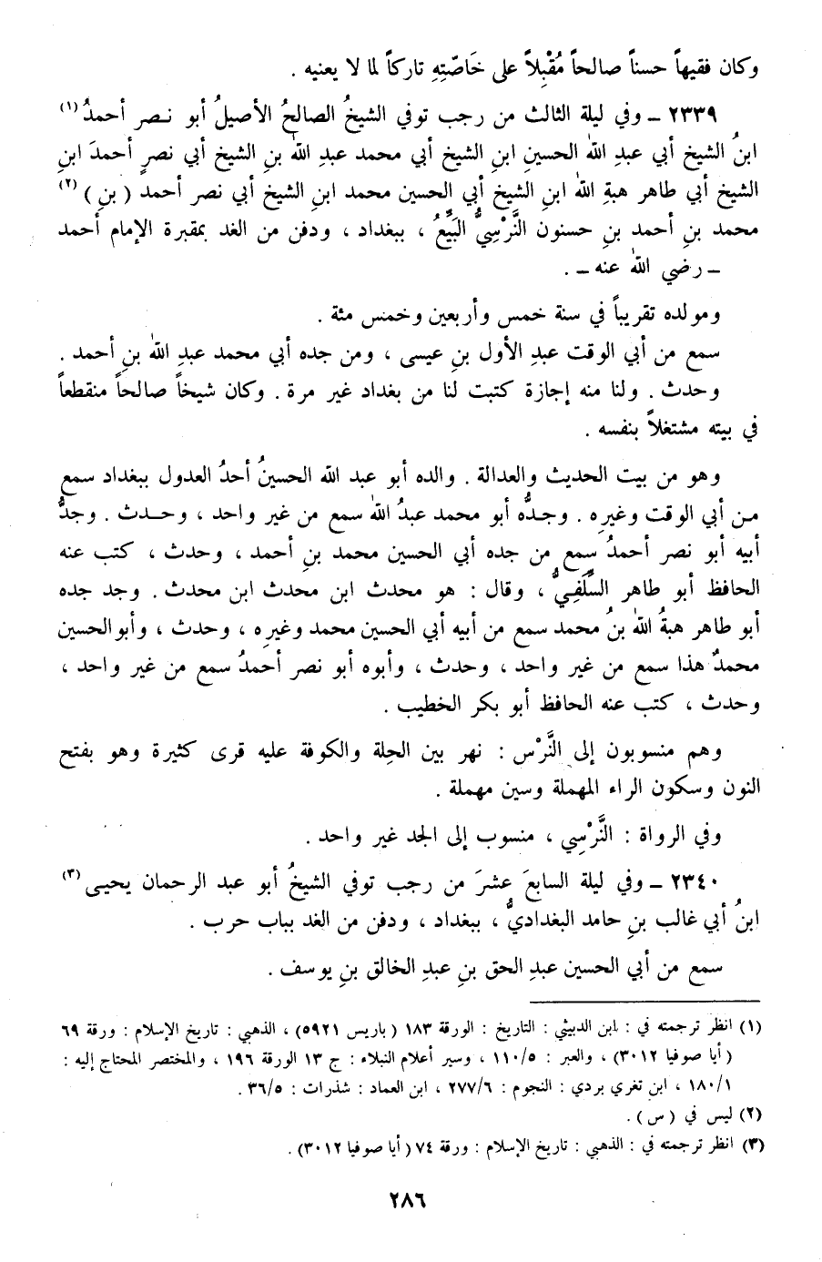 2339 - وفي ليلة الثالث من رجب توفي الشيخ الصالح الأصيل أبو نصر أحمد ابن الشيخ أبي عبد الله الحسين ابن الشيخ أبي محمد عبد الله بن الشيخ أبي نصر أحمد ابن الشيخ أبي طاهر هبة الله ابن الشيخ أبي الحسين محمد ابن الشيخ أبي نصر أحمد (بن) محمد بن أحمد بن حسنون النرسي البيع، ببغداد، ودفن من الغد بمقبرة الإمام أحمد -رضي الله عنه-.