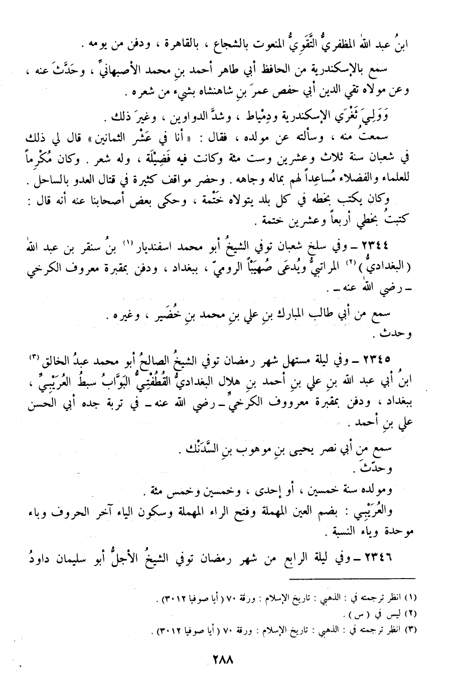 2344 - وفي سلخ شعبان توفي الشيخ أبو محمد اسفنديار بن سنقر بن عبد الله (البغدادي) المراتبي ويدعى صهيبا الرومي، ببغداد، ودفن بمقبرة معروف الكرخي -رضي الله عنه-.
