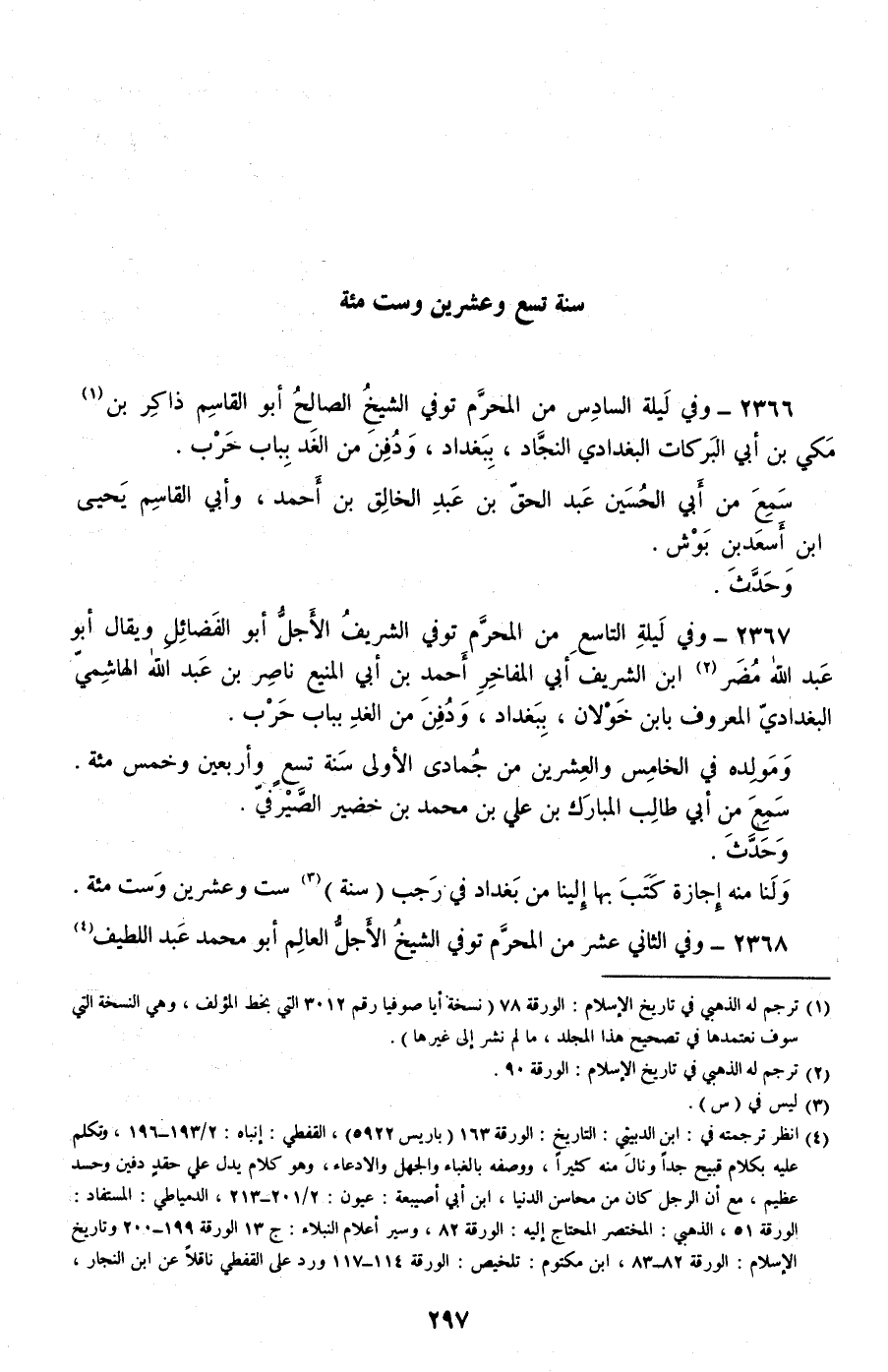 2366 - وفي ليلة السادس من المحرم توفي الشيخ الصالح أبو القاسم ذاكر بن مكي بن أبي البركات البغدادي النجاد، ببغداد، ودفن من الغد بباب حرب.