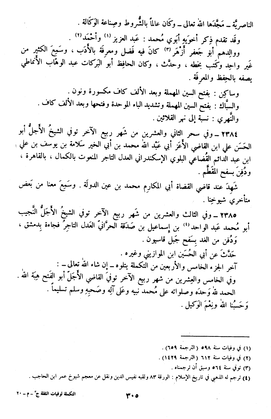 2385 - وفي الثالث والعشرين من شهر ربيع الآخر توفي الشيخ الأجل النجيب أبو محمد عبد الواحد بن إسماعيل بن صدقة الحراني العدل التاجر فجاءة بدمشق، ودفن من الغد بسفح جبل قاسيون.