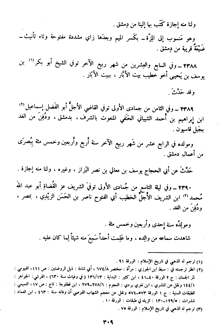 2389 - وفي الثامن من جمادى الأولى توفي القاضي الأجل أبو الفضل إسماعيل بن إبراهيم بن أحمد الشيباني الحنفي المنعوت بالشرف، بدمشق، ودفن من الغد بجبل قاسيون.