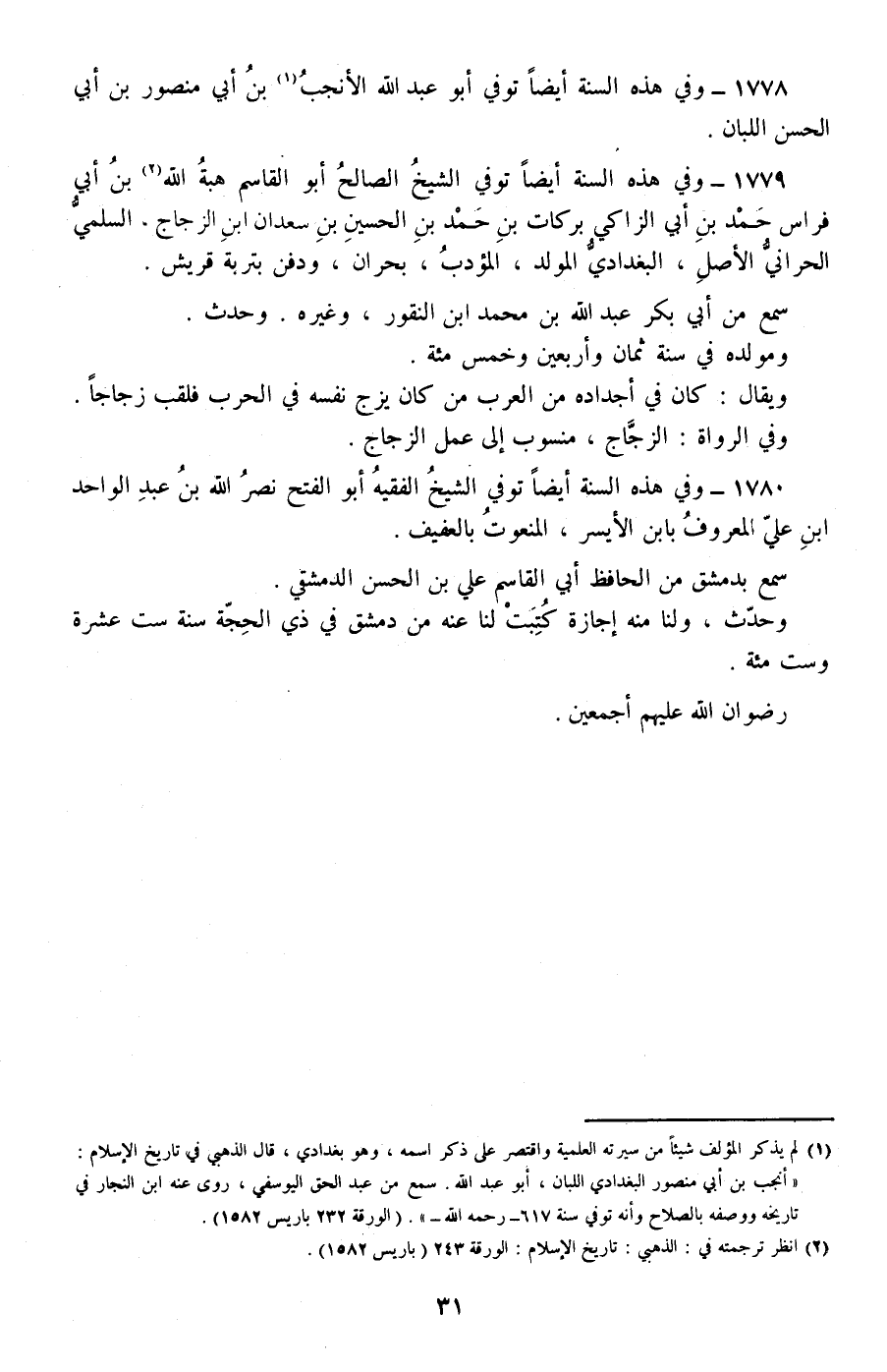 1779 - وفي هذه السنة أيضا توفي الشيخ الصالح أبو القاسم هبة الله بن أبي فراس حمد بن أبي الزاكي بركات بن حمد بن الحسين بن سعدان ابن الزجاج، السلمي الحراني الأصل، البغدادي المولد، المؤدب، بحران، ودفن بتربة قريش.