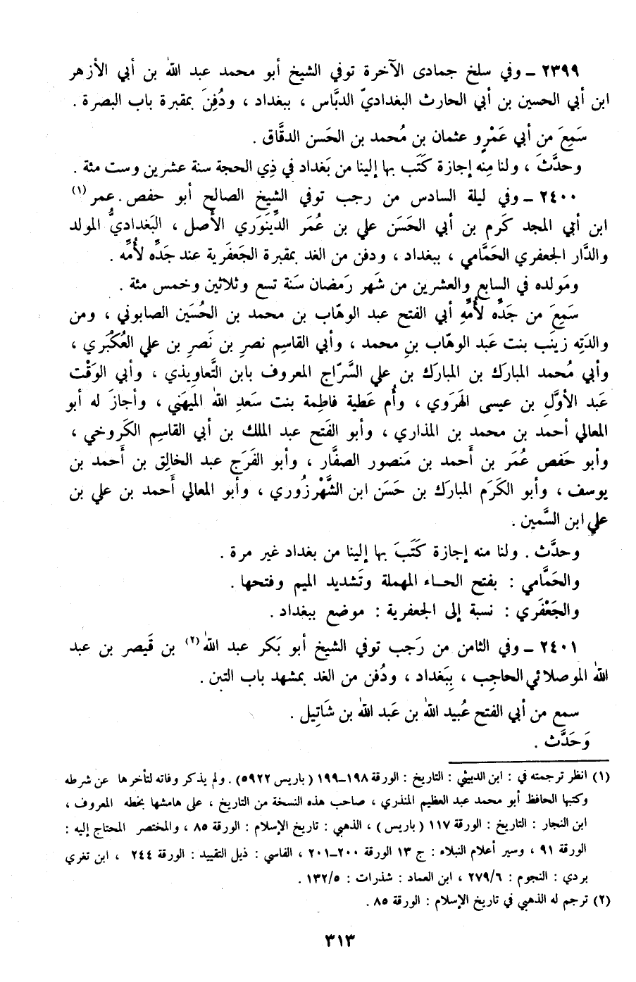 2399 - وفي سلخ جمادى الآخرة توفي الشيخ أبو محمد عبد الله بن أبي الأزهر بن أبي الحسين بن أبي الحارث البغدادي الدباس، ببغداد، ودفن بمقبرة باب البصرة.