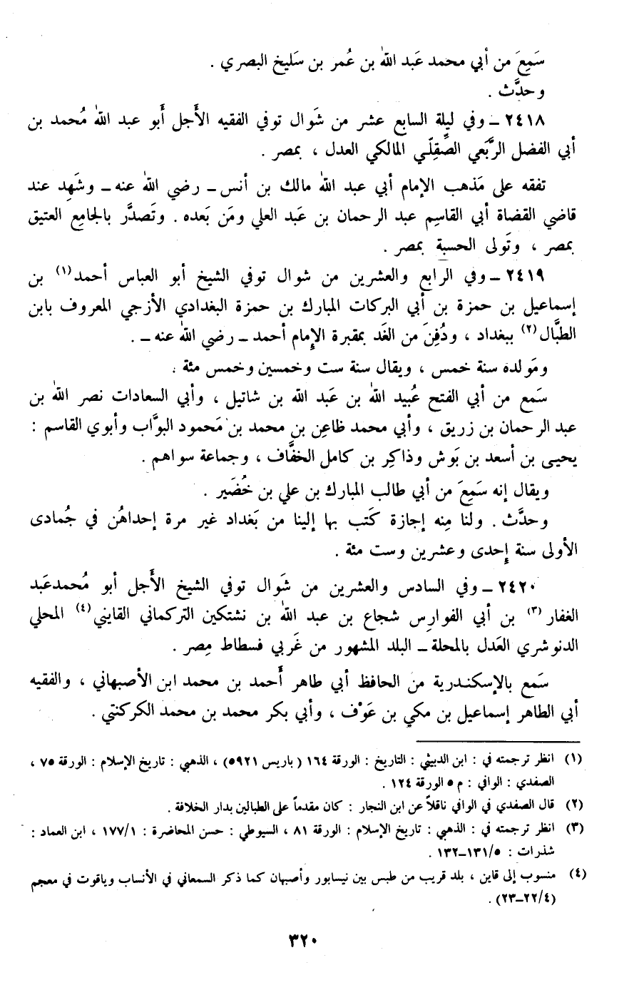 2420 - وفي السادس والعشرين من شوال توفي الشيخ الأجل أبو محمد عبد الغفار بن أبي الفوارس شجاع بن عبد الله بن نشتكين التركماني القايني المحلي الدنوشري العدل بالمحلة -البلد المشهور من غربي فسطاط مصر-.