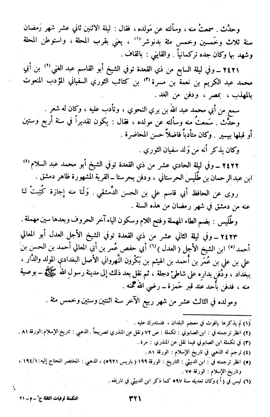 2422 - وفي ليلة الحادي عشر من ذي القعدة توفي الشيخ أبو محمد عبد السلام بن عبد الرحمان بن طليس الحرستاني، ودفن بحرستا -القرية المشهورة ظاهر دمشق-.