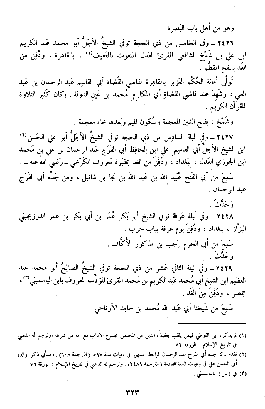2427 - وفي ليلة السادس من ذي الحجة توفي الشيخ الأجل أبو علي الحسن ابن الشيخ الأجل أبي القاسم علي ابن الحافظ أبي الفرج عبد الرحمان بن علي بن محمد ابن الجوزي العدل، ببغداد، ودفن من الغد بمقبرة معروف الكرخي -رضي الله عنه-.