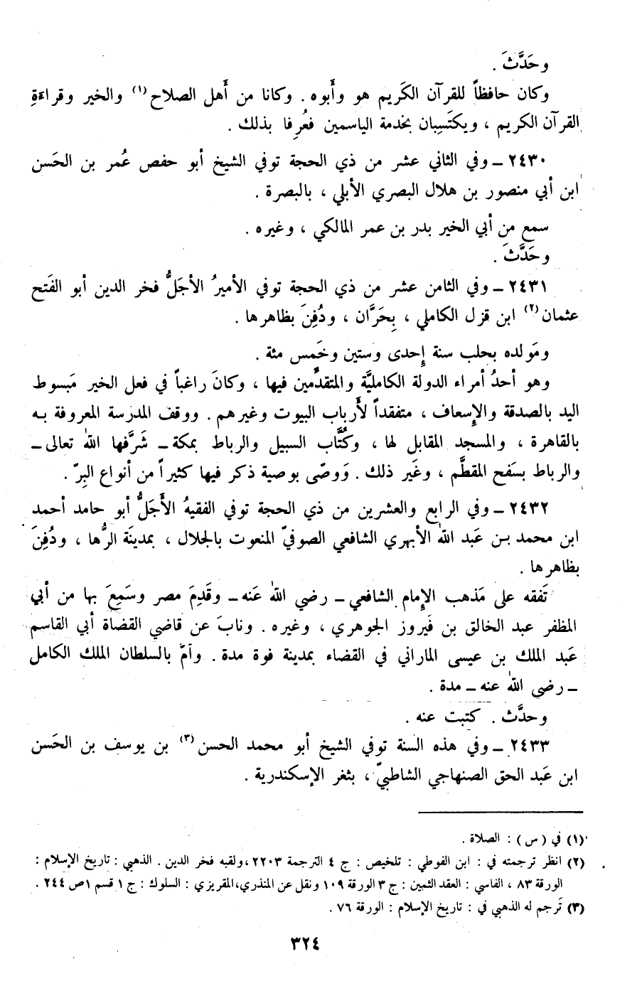 2433 - وفي هذه السنة توفي الشيخ أبو محمد الحسن بن يوسف بن الحسن بن عبد الحق الصنهاجي الشاطبي، بثغر الإسكندرية.