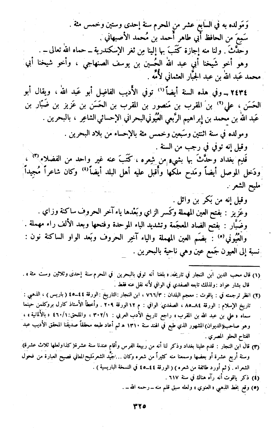 2434 - وفي هذه السنة أيضا توفي الأديب الفاضل أبو عبد الله، ويقال: أبو الحسن، علي بن المقرب بن منصور بن المقرب بن الحسن بن عزيز بن ضبار بن عبد الله بن محمد بن إبراهيم الربعي العيوني البحراني الإحسائي الشاعر، بالبحرين.