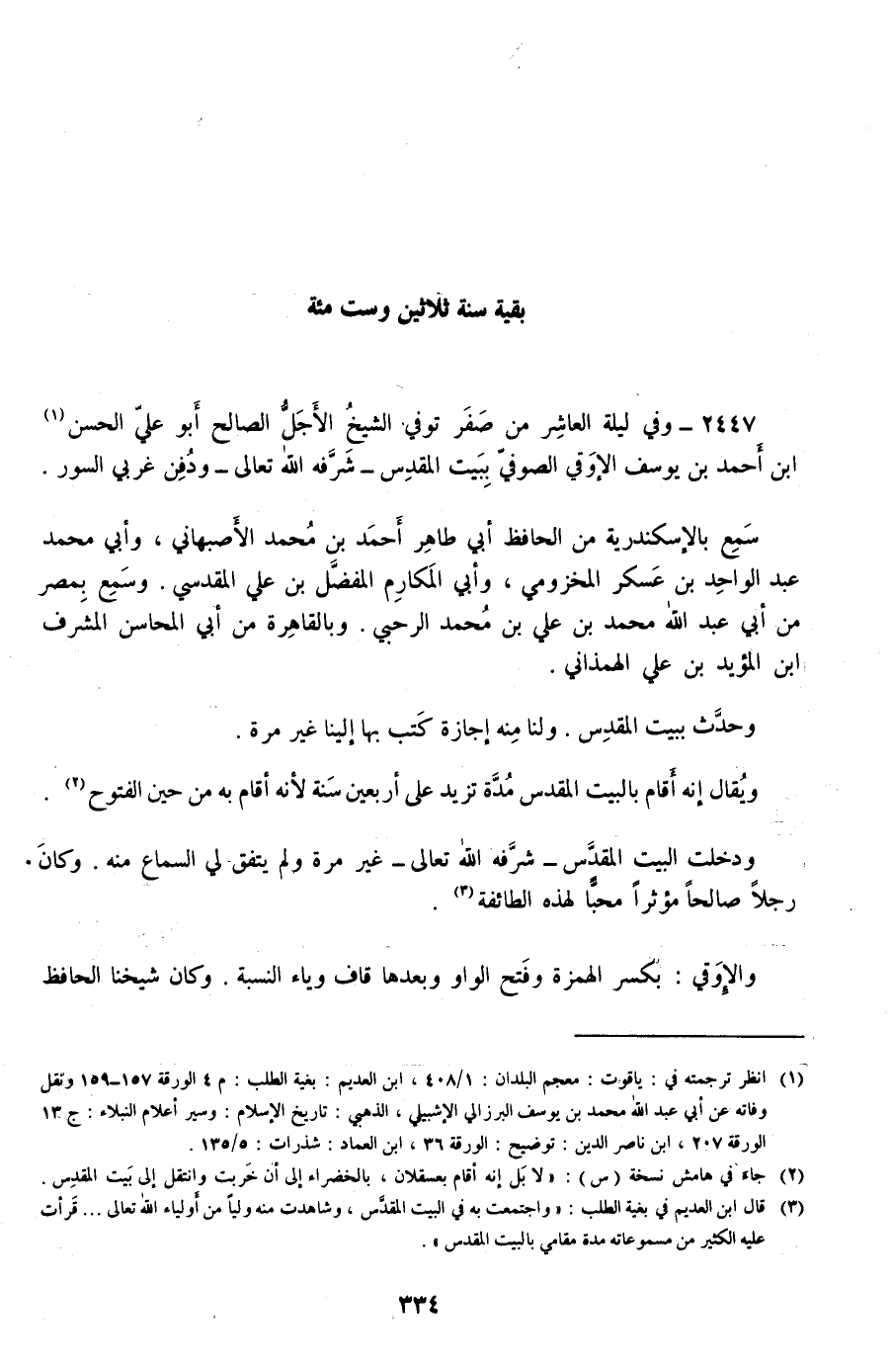 2447 - وفي ليلة العاشر من صفر توفي الشيخ الأجل الصالح أبو علي الحسن بن أحمد بن يوسف الإوقي الصوفي ببيت المقدس -شرفه الله تعالى- ودفن غربي السور.