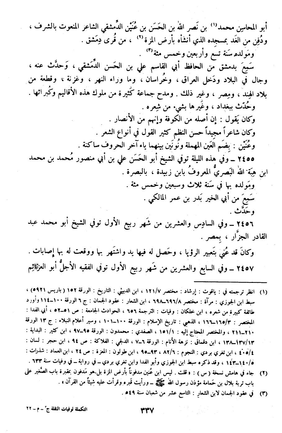 2457 - وفي السابع والعشرين من شهر ربيع الأول توفي الفقيه الأجل أبو العزائم همام بن راجي الله بن سرايا بن أبي الفتوح ناصر بن داود الشافعي المنعوت بالجلال، بالشارع ظاهر القاهرة، #338# ودفن من الغد بسفح المقطم.