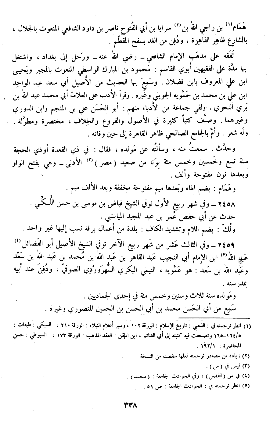 2459 - وفي الثالث عشر من شهر ربيع الآخر توفي الشيخ الأصيل أبو الفضائل عبد الله ابن الإمام أبي النجيب عبد القاهر بن عبد الله بن محمد بن عبد الله بن سعد وعبد الله بن سعد: هو عمويه، التيمي البكري السهروردي الصوفي، ودفن عند أبيه بمدرسته.