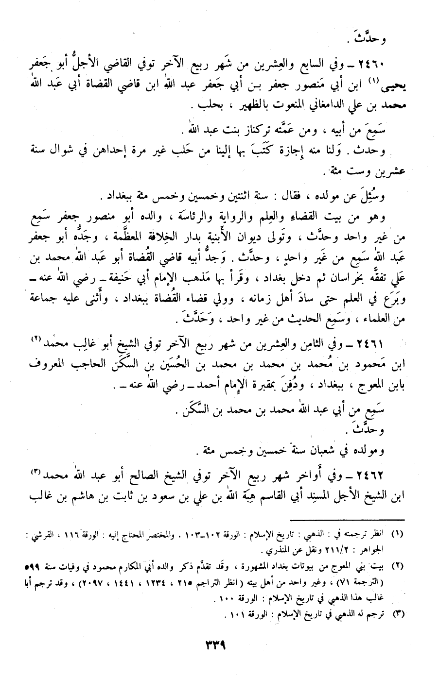2460 - وفي السابع والعشرين من شهر ربيع الآخر توفي القاضي الأجل أبو جعفر يحيى بن أبي منصور جعفر بن أبي جعفر عبد الله ابن قاضي القضاة أبي عبد الله محمد بن علي الدامغاني المنعوت بالظهير، بحلب.