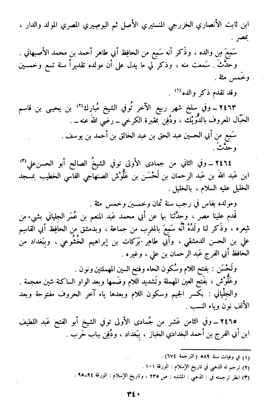 2465 - وفي الثامن عشر من جمادى الأولى توفي الشيخ أبو الفتح عبد اللطيف بن أبي الفرج بن أحمد البغدادي الخباز، ببغداد، ودفن بباب حرب.