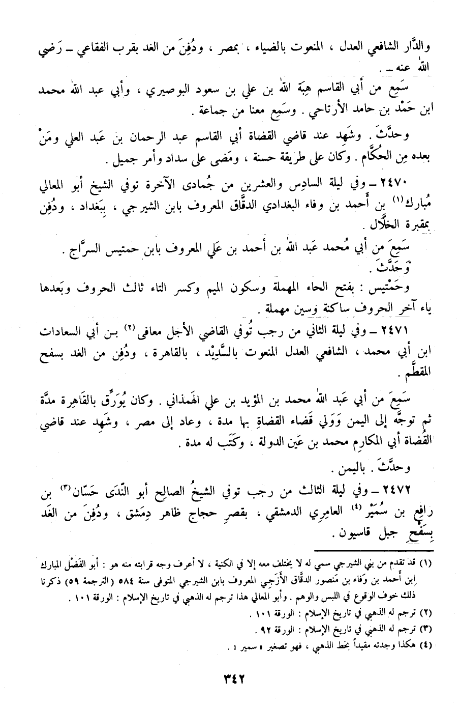 2472 - وفي ليلة الثالث من رجب توفي الشيخ الصالح أبو الندى حسان بن رافع بن سمير العامري الدمشقي، بقصر حجاج ظاهر دمشق، ودفن من الغد بسفح جبل قاسيون.