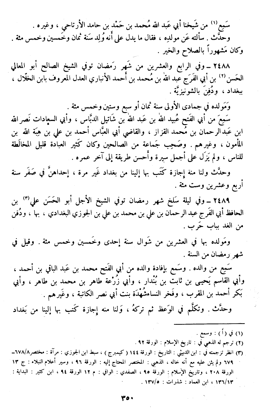 2489 - وفي ليلة سلخ شهر رمضان توفي الشيخ الأجل أبو الحسن علي بن الحافظ أبي الفرج عبد الرحمان بن علي بن محمد بن علي بن الجوزي البغدادي، بها ودفن من الغد بباب حرب.