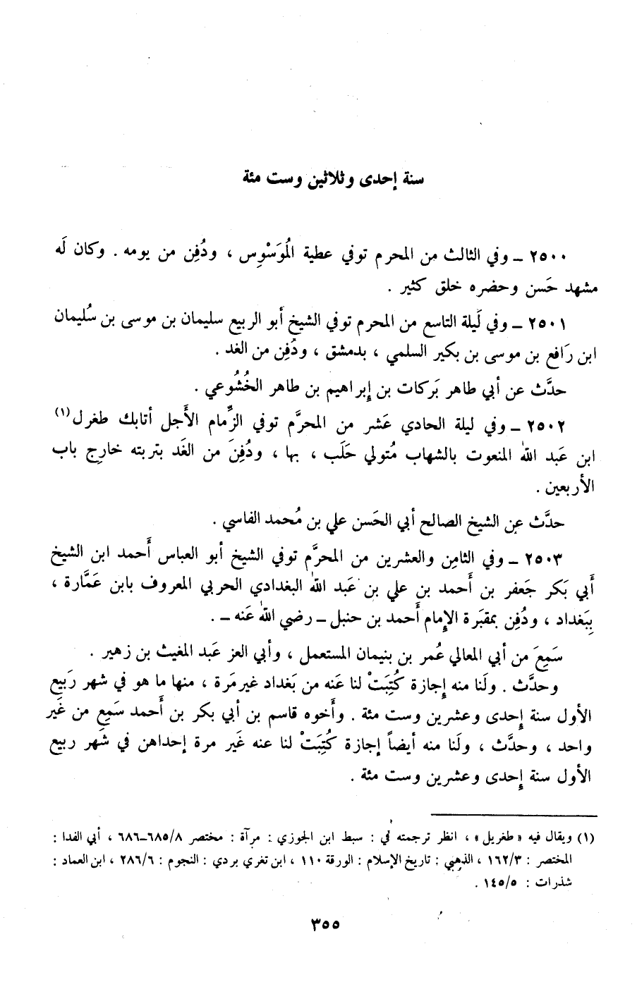 2503 - وفي الثامن والعشرين من المحرم توفي الشيخ أبو العباس أحمد ابن الشيخ أبي بكر جعفر بن أحمد بن علي بن عبد الله البغدادي الحربي المعروف بابن عمارة، ببغداد، ودفن بمقبرة الإمام أحمد بن حنبل -رضي الله عنه-.
