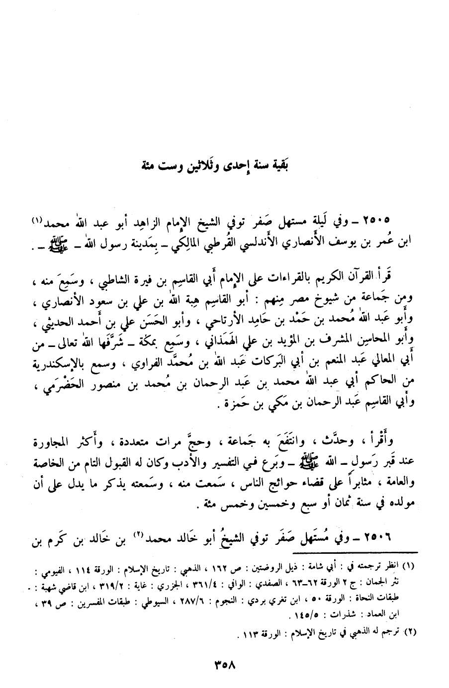2505 - وفي ليلة مستهل صفر توفي الشيخ الإمام الزاهد أبو عبد الله محمد بن عمر بن يوسف الأنصاري الأندلسي القرطبي المالكي -بمدينة رسول الله صلى الله عليه وسلم-.