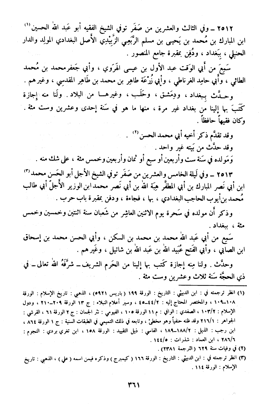 2512 - وفي الثالث والعشرين من صفر توفي الشيخ الفقيه أبو عبد الله الحسين بن المبارك بن محمد بن يحيى بن مسلم الربعي الزبيدي الأصل البغدادي المولد والدار الحنبلي، ببغداد، ودفن بمقبرة جامع المنصور.