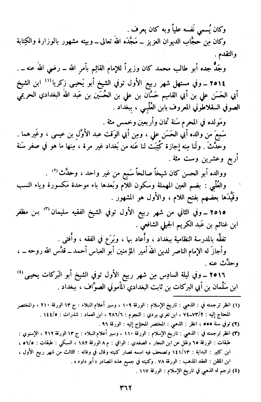 2514 - وفي مستهل شهر ربيع الأول توفي الشيخ أبو يحيى زكريا ابن الشيخ أبي الحسن علي بن أبي القاسم حسان بن علي بن الحسين بن عبد الله البغدادي الحريمي الصوفي السقلاطوني المعروف بابن العلبي، ببغداد.