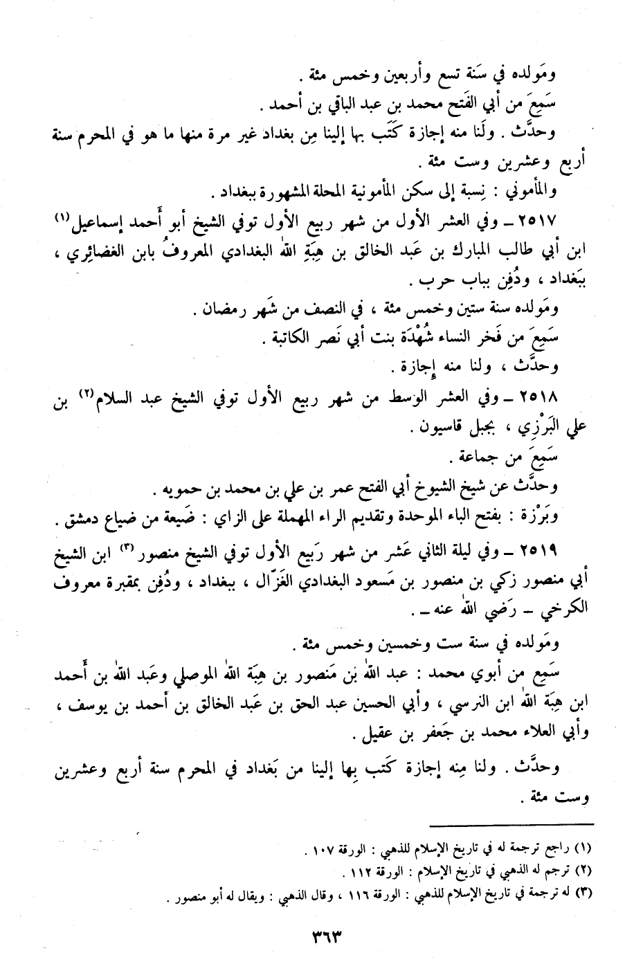 2517 - وفي العشر الأول من شهر ربيع الأول توفي الشيخ أبو أحمد إسماعيل بن أبي طالب المبارك بن عبد الخالق بن هبة الله البغدادي المعروف بابن الغضائري، ببغداد، ودفن بباب حرب.