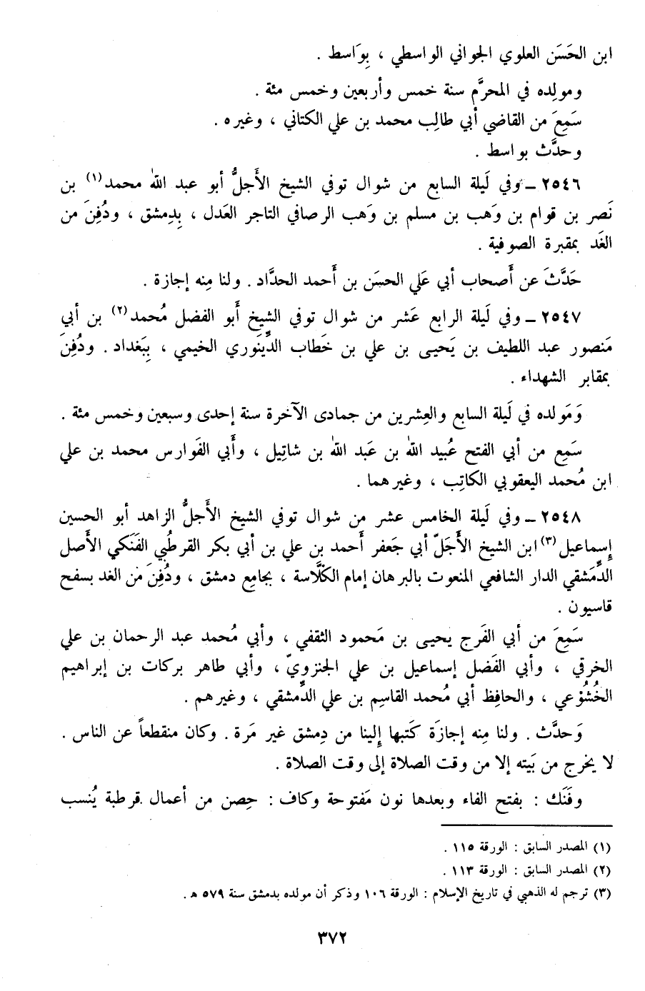 2546 - وفي ليلة السابع من شوال توفي الشيخ الأجل أبو عبد الله محمد بن نصر بن قوام بن وهب بن مسلم بن وهب الرصافي التاجر العدل، بدمشق، ودفن من الغد بمقبرة الصوفية.