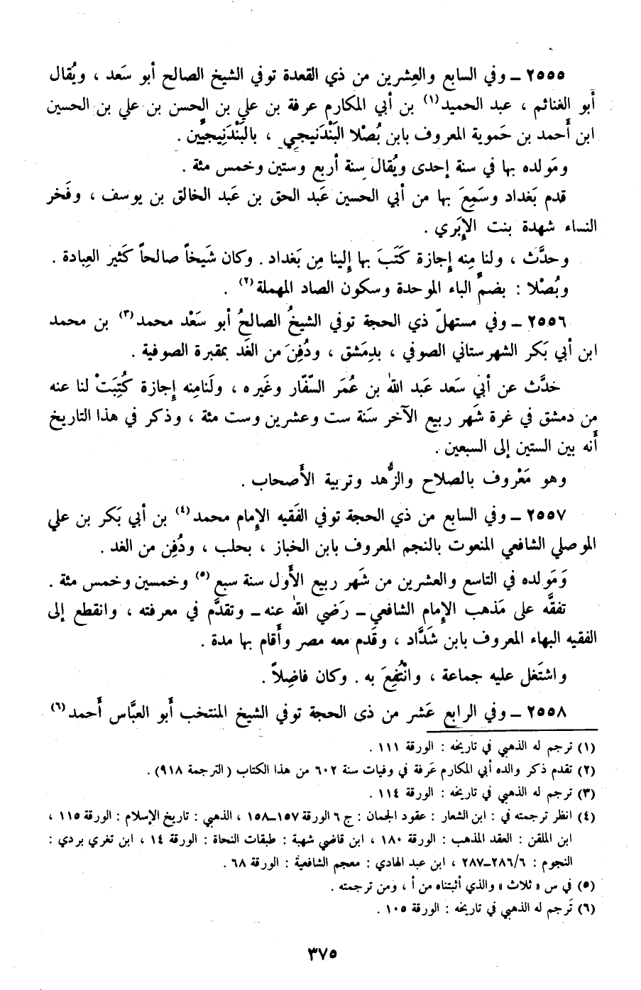 2555 - وفي السابع والعشرين من ذي القعدة توفي الشيخ الصالح أبو سعد، ويقال: أبو الغنائم، عبد الحميد بن أبي المكارم عرفة بن علي بن الحسن بن علي بن الحسين بن أحمد بن حموية المعروف بابن بصلا البندنيجي، بالبندنيجيين.
