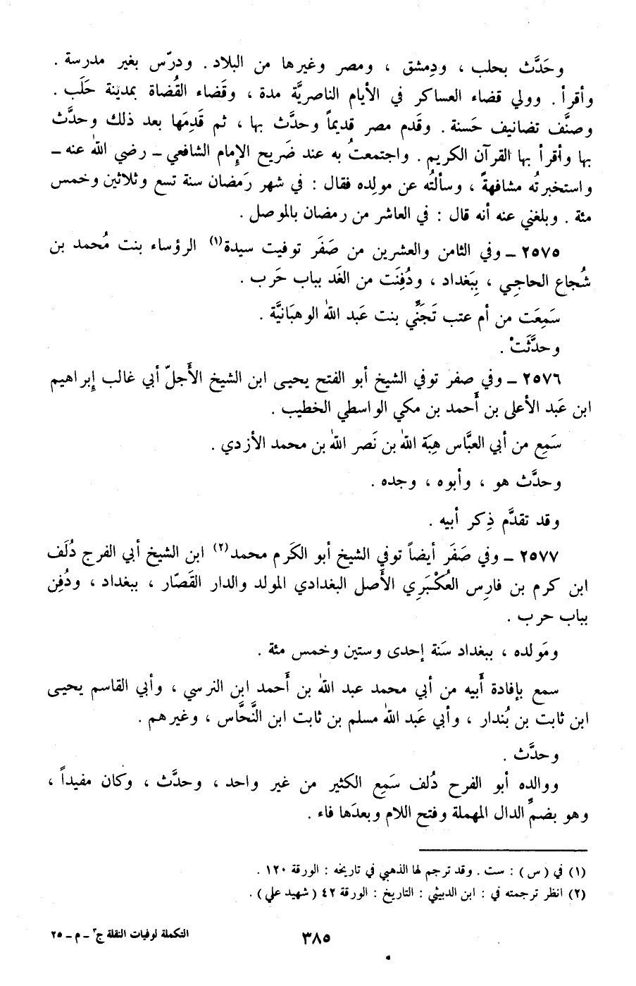 2577 - وفي صفر أيضا توفي الشيخ أبو الكرم محمد ابن الشيخ أبي الفرج دلف بن كرم بن فارس العكبري الأصل البغدادي المولد والدار القصار، ببغداد، ودفن بباب حرب.
