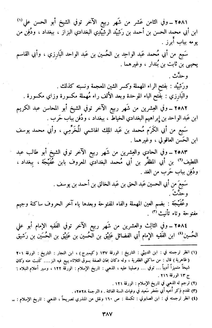 2583 - وفي الحادي والعشرين من شهر ربيع الآخر توفي الشيخ أبو طالب عبد اللطيف بن أبي المظفر بن أبي محمد البغدادي المعروف بابن عفيجة، ببغداد، ودفن بباب حرب من الغد.