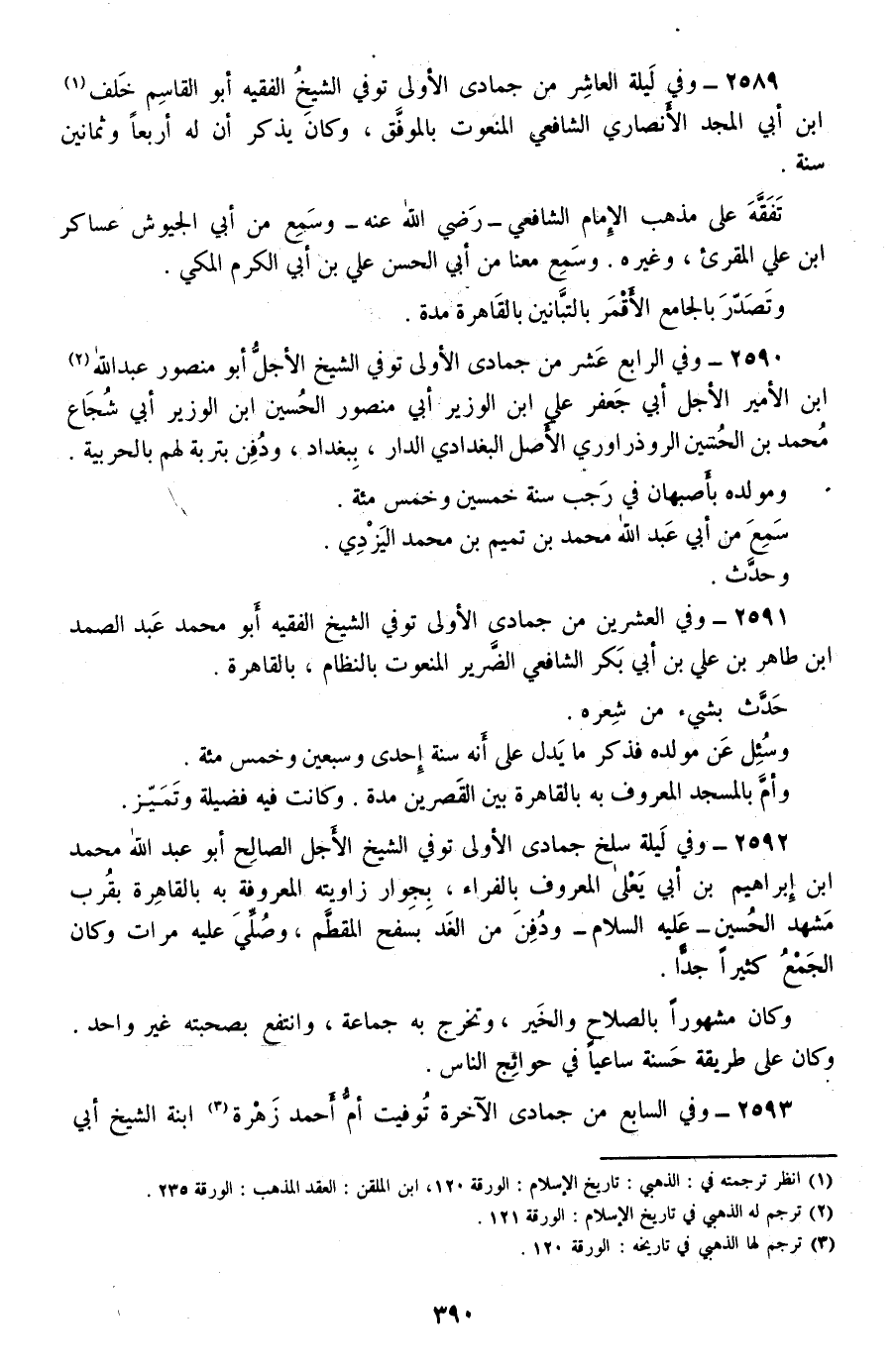 2592 - وفي ليلة سلخ جمادى الأولى توفي الشيخ الأجل الصالح أبو عبد الله محمد بن إبراهيم بن أبي يعلى المعروف بالفراء، بجوار زاويته المعروفة به بالقاهرة بقرب مشهد الحسين -عليه السلام- ودفن من الغد بسفح المقطم، وصلي عليه مرات وكان الجمع كثيرا جدا.